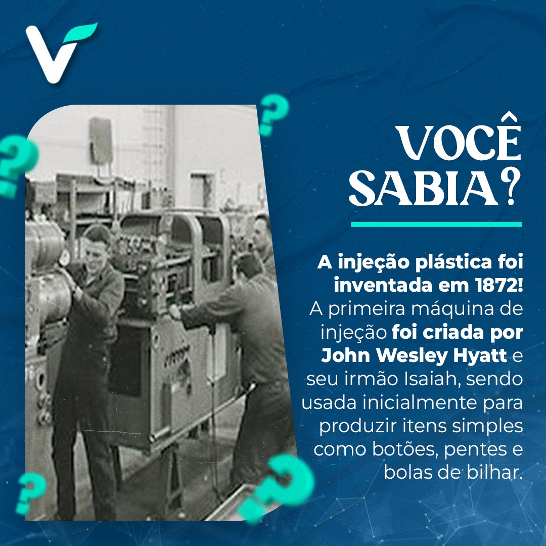 Em 1872, John Wesley Hyatt, ao lado de seu irmão Isaiah, criou a primeira máquina de moldagem por injeção plástica. O equipamento era simples, parecido com uma grande seringa hidráulica, que injetava o plástico derretido em moldes aquecidos. Essa invenção marcou o início da indústria da injeção plástica, possibilitando a produção em escala de objetos que antes eram feitos manualmente.
